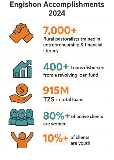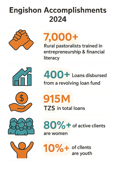 By 2024, Engishon had reached over 7,000 pastoralists with business and entrepreneurship training, helped improve their financial literacy, and provided over 915,000,000 TZS (equivalent to USD $360,000) in revolving loans to qualifying clients. Over 80% of people directly benefitting from ENGISHON loans in 2024 are women, and over 10% are youth.